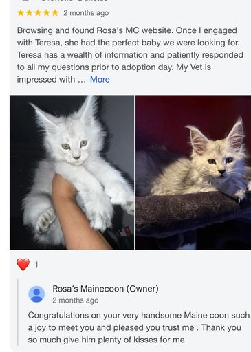 Almost gave up on my search and then I found Mrs. Teresa. She was extremely professional, immediately offered to video chat to see the available kitties she had, I laid eyes on my handsome and just knew he was meant to be ours. Teresa was very nice and knowledgeable and had amazing communication. Any questions I had she quickly responded. 10/10 would recommend Rosa’s MCO. Hoping to return in the future for another baby. Beautiful, well taken care of kitties.